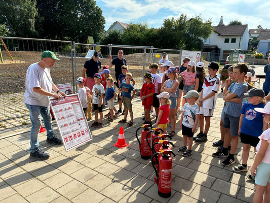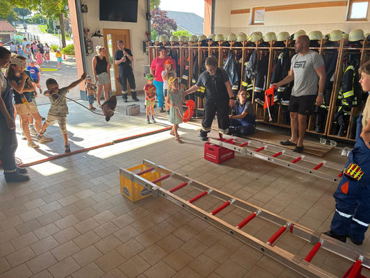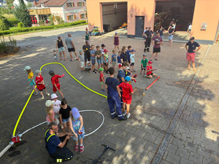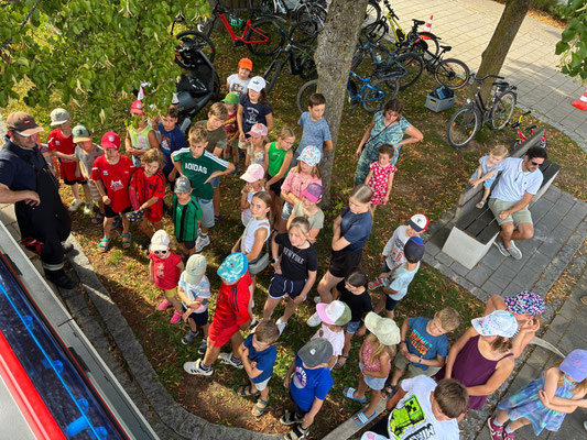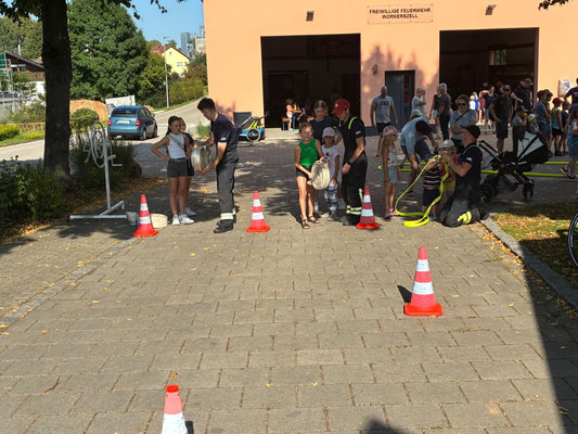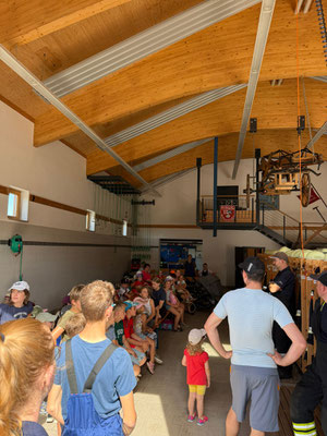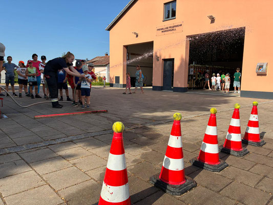Die Kinder des Kindergartens Rupertsbuch besuchten zuerst die FFW Workerszell im Feuerwehrhaus. Hier wurden ihnen die Geräte der Feuerwehr und ihre Aufgaben erklärt. Im Anschluss wurde in einer gemeinsamen Übung noch die Flucht aus dem "brennenden" Kindergarten zum Sammelplatz geübt. Danach durften die Kinder noch mit versch. Strahlrohren das "Feuer löschen".