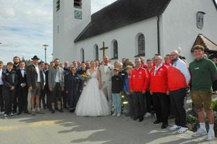 Nach der kirchlichen Trauung gratulierten Alexander Kirschner, Bernhard Biehler und die Fahnenabordnung mit Dominik Kahl, Dominik Bittl und Matthias Lang von der FF Workerszell und überreichten ein kleines Geschenk. Wir wünschen den Beiden alles Gute auf Ihrem gemeinsamen Lebensweg!
